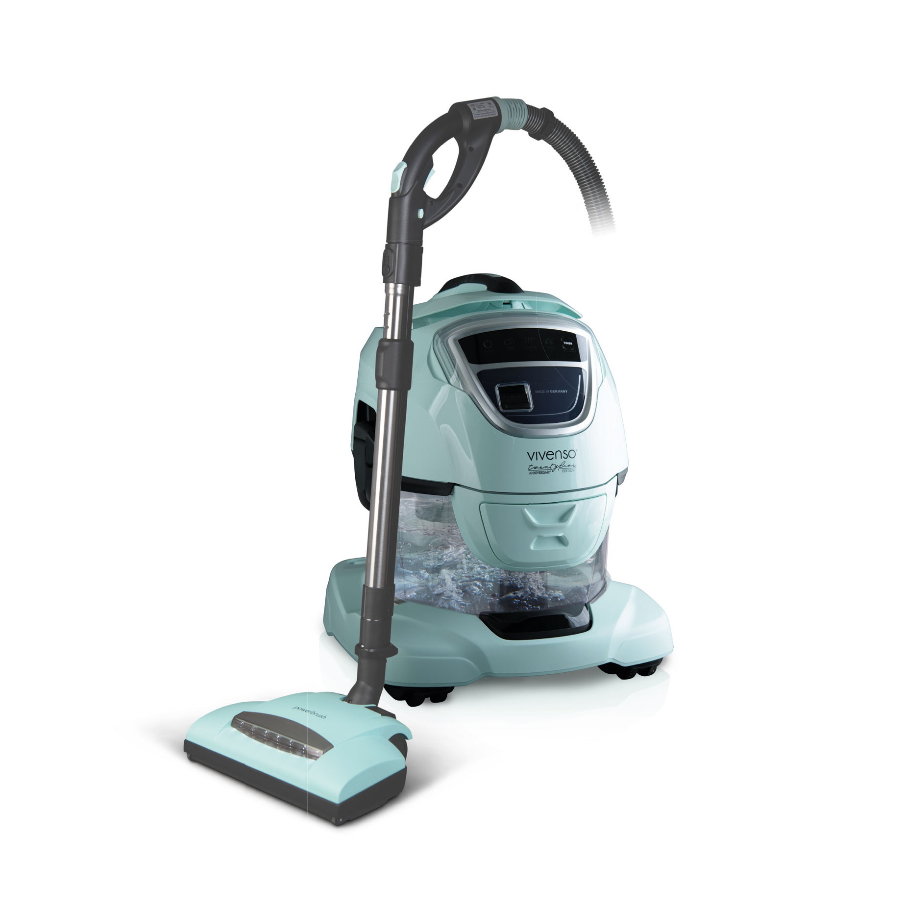 Vivenso Touch Limited Edition in Türkis – exklusives Jubiläumsmodell zum 25-jährigen Bestehen von Pro-Aqua. Mit edlem türkisen Design, modernem Touch-Bedienfeld und passender Elektrobürste. Die bewährte Wasserfilter- und Separatorentechnik bindet Staub und Allergene zuverlässig. Für kraftvolle, leise Tiefenreinigung von Böden, Polstern und Matratzen. Limitiert, hochwertig, einzigartig.